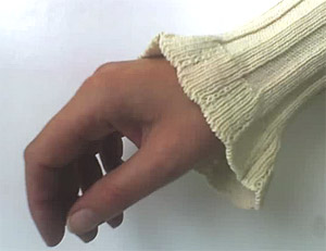 Das Muster ist rein funktional; es dient nämlich dazu, dem oberen Pulloverteil Weite zu geben, ohne dass ich Maschen hätte zunehmen müssen. Um Hüfte und Taille herum ist der Pulli im Rippenmuster (4 rechts, 4 links) gestrickt und liegt eng an. Der Clou an diesem Pulli sind die modisch weiten Trompetenärmel. Sie haben etwas, aber nicht zuviel Überlänge. (Beim Händewaschen, Abwaschen und ähnlichen Tätigkeiten kann ich sie einfach hochklappen.) Und sie sind mit der Strickmaschine ziemlich einfach zu stricken: |