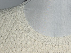 Natürlich ist auch der Halsausschnitt sauber ausgearbeitet. Ich habe ihn, wie ich es meistens mache, in verkürzten Reihen gestrickt und dann eine 4 rechts, 4 links gestrickte Blende angebracht. Das ist Ausschnitt Nr. 13 aus dem Kragenbuch. Dabei muss man nicht soviel nähen. Ich bin ja faul. ;-) |