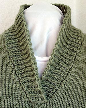 Dieser V-Ausschnitt hat in der vorderen Mitte eine gerade abgekettete Kante, an die die Schmalseiten der Blende angenäht werden. Die Blende ist in einem Stück quer gestrickt. Die 110 Nadeln des Doppelbetts reichten dafür gerade aus. Man kann so eine Blende nicht wie beim Handstricken direkt aus der Kante herausstricken. Sie wird von der Außenkante her angefangen. Ist sie vollendet, dann hängt man alle Maschen aufs HNB um, hängt die Ausschnittkante abschnittsweise dazu und kettet jeweils einen Teil gemeinsam ab, bevor der nächste Teil des Ausschnitts eingehängt wird. |