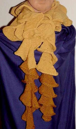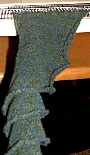 Korkenzieher-Schal auf der Strickmaschine© 2005 Michaela Renz. Die Weitergabe dieser Anleitung ist erlaubt, sofern dieser Copyright-Hinweis dabei ist. Die Verwendung dieser Anleitung für kommerzielle Zwecke ist nicht zulässig. Wer noch Anregungen für ein Weihnachtsgeschenk braucht: mit einem Korkenzieherschal löst man zumindest einen Überraschungseffekt aus. Der Schal ist auch für Anfänger leicht anzufertigen und eine Einbettmaschine reicht aus. Allerdings sollte man mindestens vier bis fünf Stunden Strickzeit kalkulieren. Diese beiden Vorschläge wurden mit dem Brother Feinstricker KH 830 mit Lochkartenautomatik gestrickt. Der petrolfarbene Schal hat ein Fangpatentmuster, er lässt sich enger rollen. Beim gelben wurden mehr Maschen angeschlagen und glatt gestrickt, er schmiegt sich üppiger um den Hals. Durch den sich einrollenden Außenrand ist die Korkenzieherdrehung nicht so stabil.