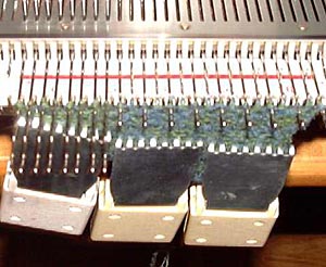 Material: Für einen Schal von 180-200 cm Länge etwa 200-250 g (je nach Schwere des Materials) maschinengeeignetes Strickgarn. Weiches Garn schmiegt sich angenehm um den Hals, am besten einen "Fühltest" machen. Garnstärken bis etwa Strumpfwolldicke lassen sich auf dem Feinstricker am leichtesten verarbeiten. Für den petrolfarbenen Schal habe ich einen Faden Bouclégarn und einen Faden Schurwolle genommen. Der gelbe Schal besteht aus mehrfädigem Merinogarn und die goldbraunen Enden aus einer Mischung von Viscose und Acryl. Beides sind No-Name-Konengarne. Die Schals eignen sich hervorragend für die Resteverarbeitung. Maschenweite: Für das gewählte Garn passend, eher locker als zu fest. |