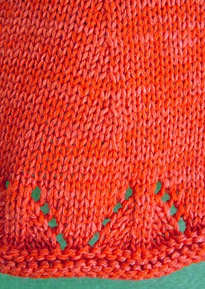 Zweitens fügte ich beim Vorderteil gleich nach dem Ende der Zunahmen für die Oberweite noch verkürzte Reihen ein, um die Passform zu verbessern. Zehn Reihen, in denen jeweils 7 + 1 M stillgelegt wurden, genügten; die Passform ist damit ausgezeichnet. Drittens ließ ich bei den Ärmeln das kleine Fangmuster weg, das im Original, kaum erkennbar, vorhanden ist. Auf dieser Basis, mit einem erprobten Schnitt, lassen sich sehr einfach noch weitere Sommerpullis stricken. |