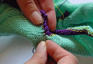 Der Maschenstich lässt sich am besten von der rechtsgestrickten Seite arbeiten. Da er von beiden Seiten gleich aussieht, ist es egal, ob später die linksgestrickte Seite außen zu liegen kommt. Mit dem Strickgarn und einer stumpfen Sticknadel nähen. Das Kontrastgarn zur linksgestrickten Seite einklappen, damit man den Maschenverlauf sieht.