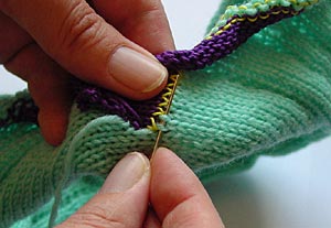 Es werden immer abwechselnd 2 halbe Maschenbögen von der einen und der anderen Seite aufgenommen, dabei wird jeweils von oben, also von der rechtsgestrickten Seite aus, eingestochen und auch wieder ausgestochen. Der Verlauf der Maschen wird so nachgeahmt. Hier gibt's noch eine weitere Beschreibung des Maschenstichs. |