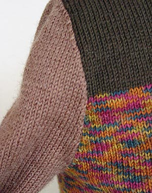 Die Restchen allein hätten kaum ein brauchbares Kleidungsstück ergeben. Aber mit ungefähr derselben Menge eines einfarbigen Garnes für Blenden und Ärmel ließen sie sich gut zusammenfügen. Nicht alle Reste waren selbstmusterndes Garn, und das war auch gut so. Die einfarbigen Flächen sorgen für die nötige "Ruhe" im Design. Zuviel Kunterbuntes aneinandergesetzt ergibt kein harmonisches Bild mehr. |