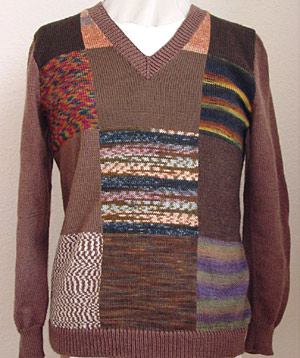 Patchwork-Pullover aus RestenBeim Durchgucken meiner Wollreste stieß ich auf ein gutes Dutzend kleinerer Knäule (jeweils zwischen 18 und 25 Gramm), die von diversen braunen und braungemusterten Socken übriggeblieben waren, insgesamt knapp 200 Gramm. Nun lag es nahe, diese Reste sinnvoll zu verarbeiten. | |