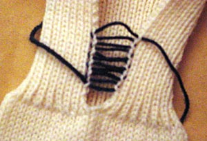Die Naht im Matratzenstich schließen (links zur Verdeutlichung mit Kontrastfaden gezeigt). Damit sie nicht aufträgt, reicht es hier, nur die halbe Randmasche zu erfassen. | ||||||||||||||||||||||||||||||||||||||||||||||||||||||||||||||||||||||||||||||||||||||||||||||||||||||||||||||||||