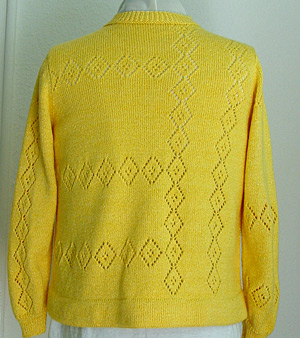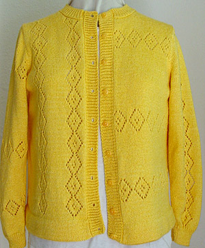 Lochmuster-Jacke aus ViskosegarnMaterial für ca. Größe 42-44: 550 g Viskose-Baumwollgarn (47 % Viskose, 47 % Baumwolle, 6 % Irisé, LL 280 m/100 g) in Gelb. Diese sommerliche Jacke ist auf der Strickmaschine Brother KH 965 mit MW 8 gestrickt. Ich wollte gern Lochmuster stricken, aber es mal etwas anders als gewöhnlich einsetzen. Am Anfang stand ich vor der Aufgabe, ein Muster zu finden, das sich sowohl in waagerechten als auch senkrechten Streifen verwenden lässt. Nach längerem Suchen entschied ich mich für Nr. 586 aus dem "Punchcard Pattern Book Vol. 5". Es ist eigentlich ein fortlaufendes Flächenmuster mit einem Rapport von 12 Maschen und 18 gestrickten Reihen. |