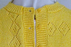 Hier noch ein Blick auf Hals- und Knopfblenden. Sie sind nach der Methode des Halsausschnitts Nr. 13 aus dem Buch "Jetzt geht's an den Kragen" gestrickt. Ich hoffe, Ihr seid etwas vorausschauender als ich und macht die Knopflöcher nicht so winzig. Es war nämlich ziemlich schwierig, dafür passende Knöpfe zu finden. ;-) |