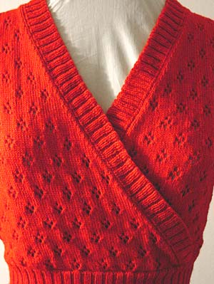 Lochmuster-Pullover im Wickel-LookMaterial: 400 g feine Cablé-Wolle für etwa Nadelstärke 2,5 oder Lauflänge 400-440 m auf 100 g. Verwendet habe ich einen alten Posten Junghans "Cablée Normal" von vor 1990. Gestrickt auf Brother KH 965 mit KR (Feinstricker, 4,5 mm Nadelabstand) und Maschenweite 7 im Lochmuster. Ich nahm das Lochmuster Nr. 165 aus dem Stitchworld Pattern Buch III, aber es eignet sich wirklich jedes kleine Lochmuster mit abgegrenzten Motiven. Klein und abgegrenzt deshalb, damit man bei jedem Motiv entscheiden kann, ob man es noch voll mitstricken kann oder lieber wegläßt, damit es nicht durch die Ausschnittlinie oder eine Naht zerschnitten wird. |
