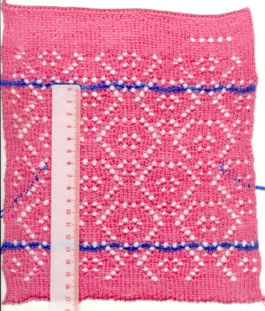Wenn man lieber "herkömmlich" rechnet, läßt es sich mit Dreisatz-Rechnung auf Reihen bzw. Maschen pro 10 cm umrechnen: Oder man verwendet das grüne Spezial-Lineal, dessen besondere Einteilung es erlaubt, sofort die Maschen (auf der S-Seite) und Reihen (auf der R-Seite) abzulesen. Es ist z.B. über die Firma Onken erhältlich. |